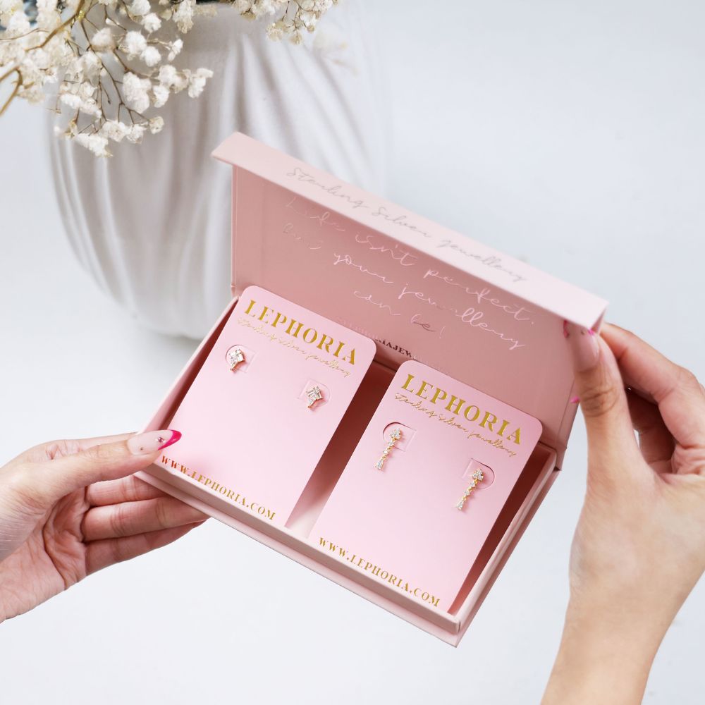 We individually package each item into our branded velvet pouches and then add them into our magnetic gift boxes, ready for you to present to your loved one. You can also add on a personalised gift note.
