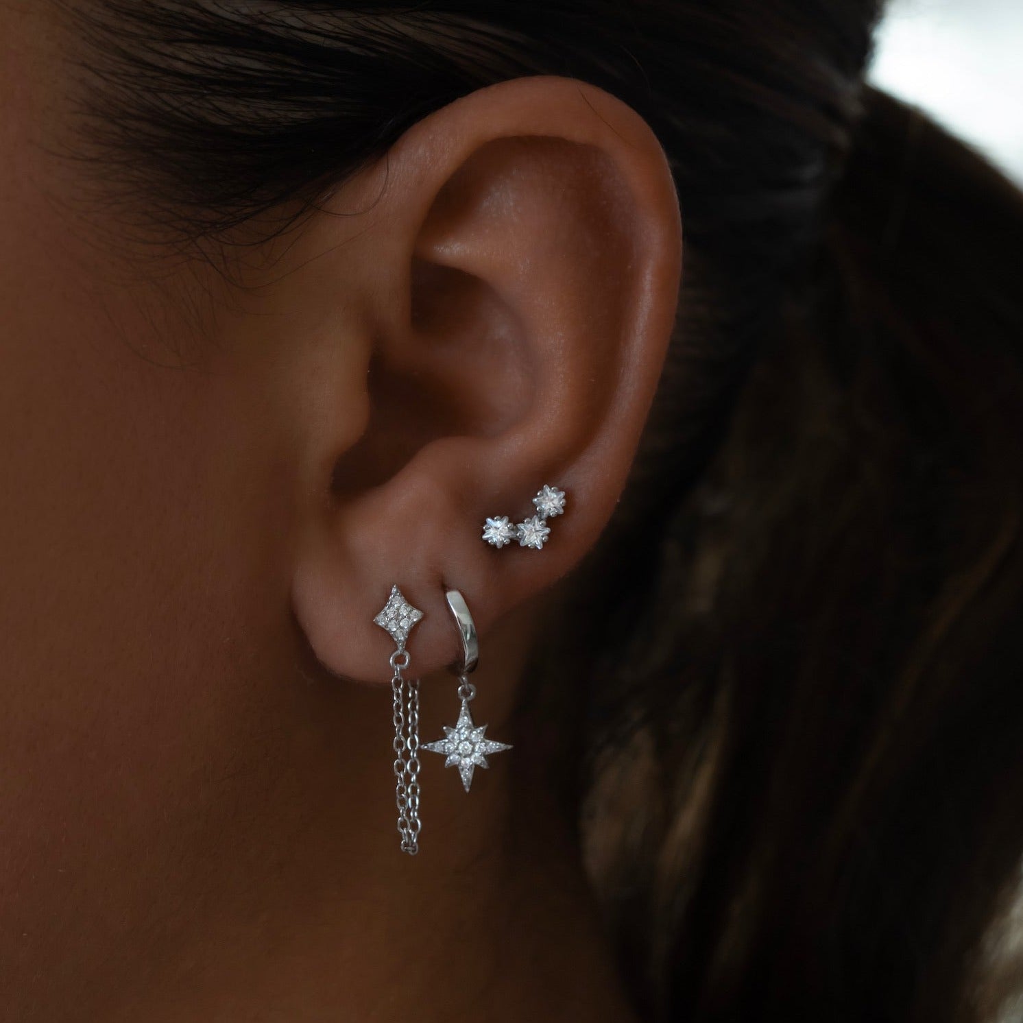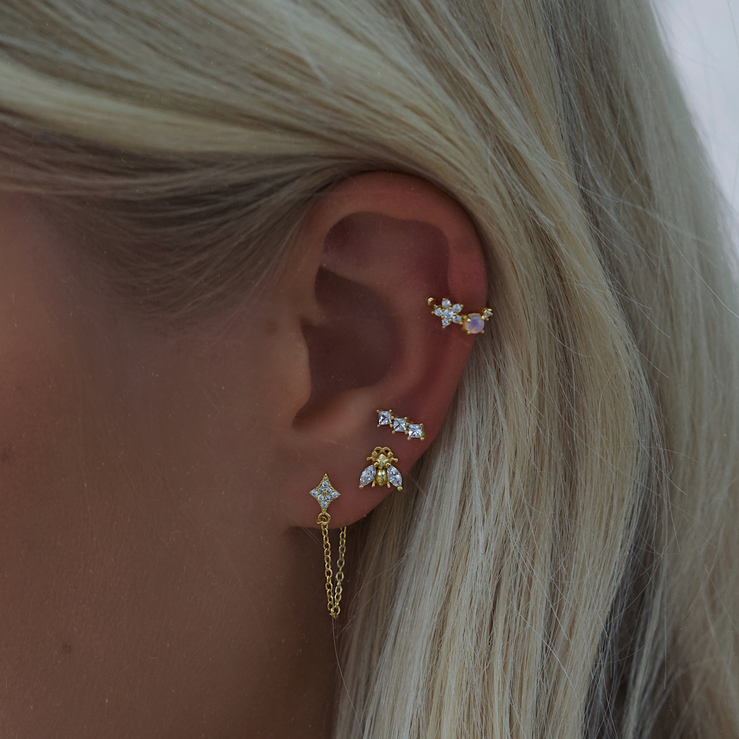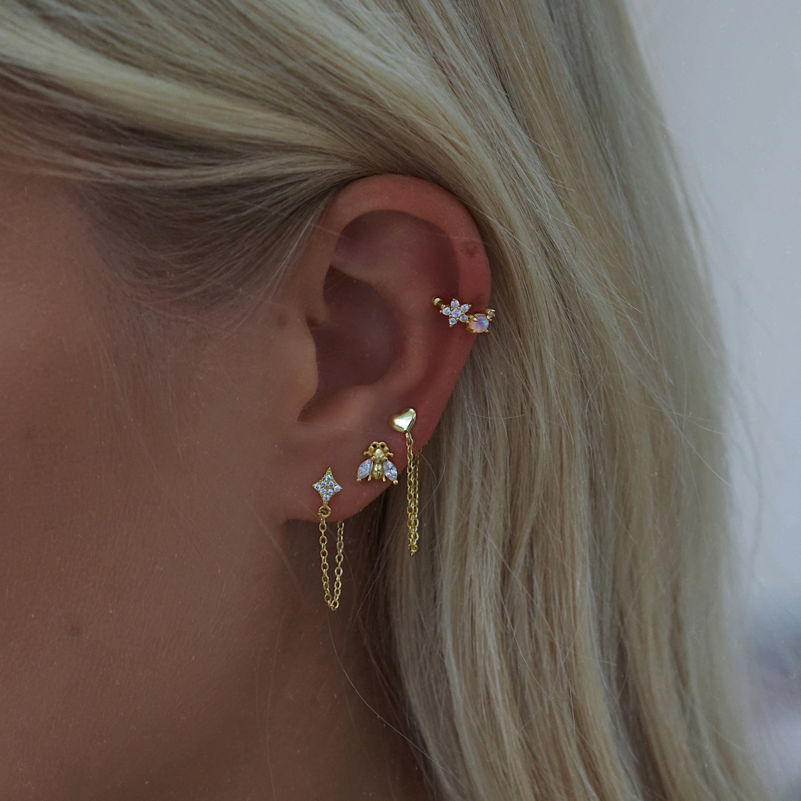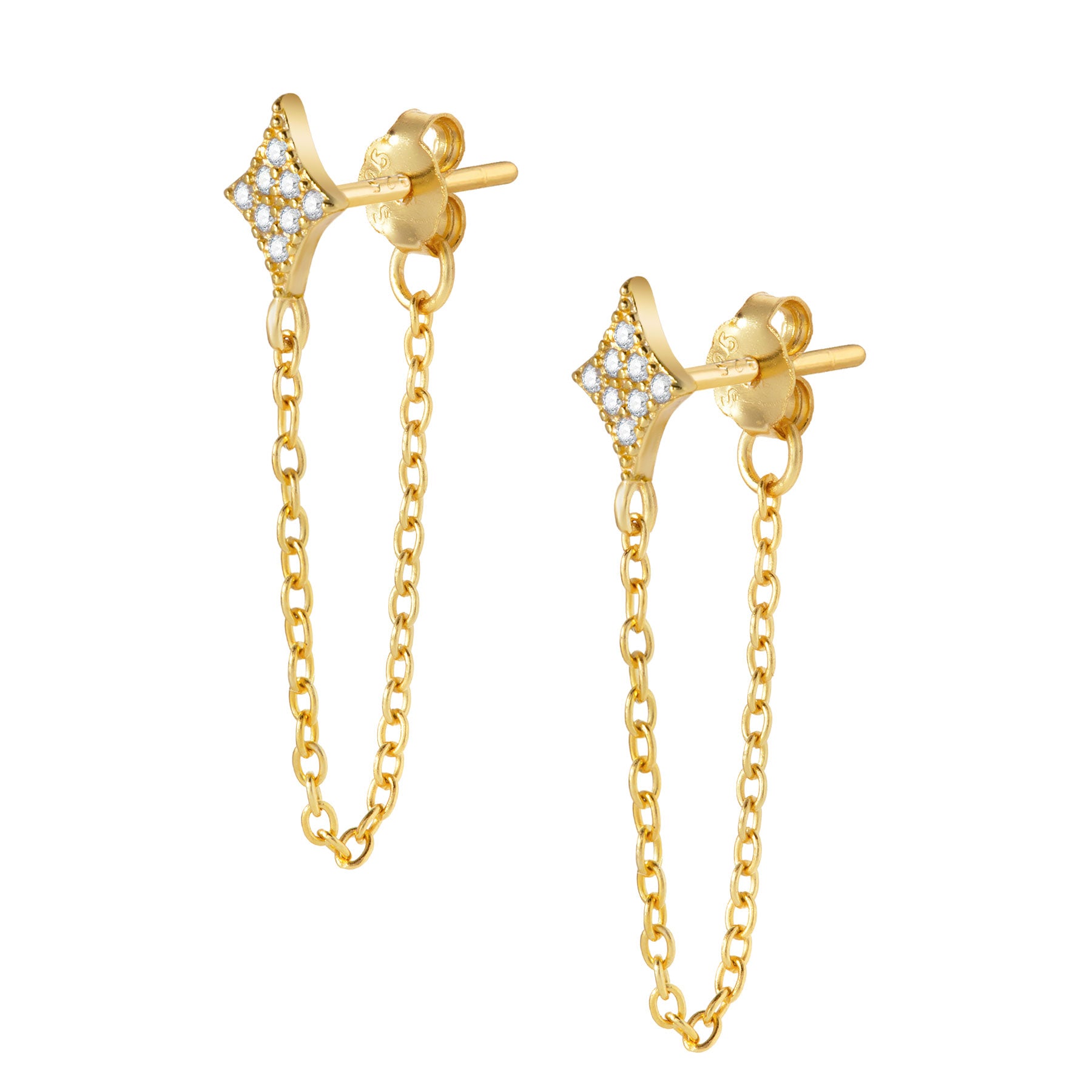 - Dainty chain connecting front earring to back